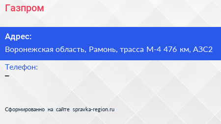 Газпром по адресу Воронежская область, Рамонь, трасса М-4 476 км, АЗС2 в дальнейшем Организация, размещена в следующих категориях: