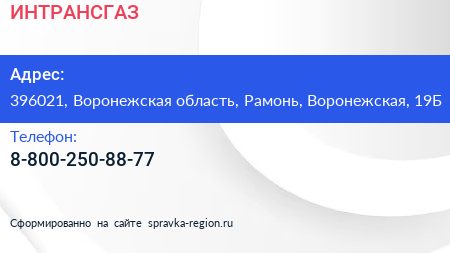ИНТРАНСГАЗ по адресу 396021, Воронежская область, Рамонь, Воронежская, 19Б в дальнейшем Организация, размещена в следующих категориях:
