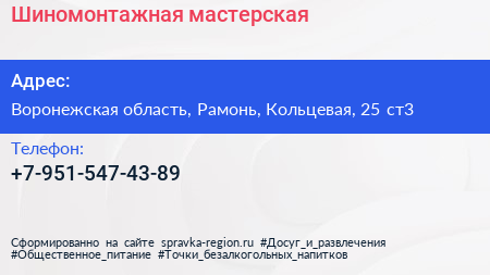 Шиномонтажная мастерская по адресу Воронежская область, Рамонь, Кольцевая, 25 ст3 в дальнейшем Организация, размещена в следующих категориях: