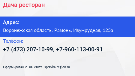 Дача, ресторан по адресу Воронежская область, Рамонь, Изумрудная, 125а в дальнейшем Организация, размещена в следующих категориях: