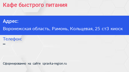 Кафе быстрого питания по адресу Воронежская область, Рамонь, Кольцевая, 25 ст3 киоск в дальнейшем Организация, размещена в следующих категориях: