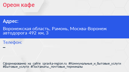 Ореон, кафе по адресу Воронежская область, Рамонь, Москва-Воронеж автодорога 492 км, 3 в дальнейшем Организация, размещена в следующих категориях: