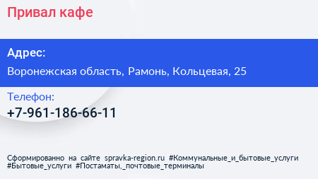 Привал, кафе по адресу Воронежская область, Рамонь, Кольцевая, 25 в дальнейшем Организация, размещена в следующих категориях: