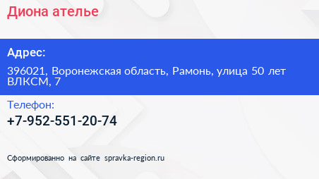Диона, ателье по адресу 396021, Воронежская область, Рамонь, улица 50 лет ВЛКСМ, 7 в дальнейшем Организация, размещена в следующих категориях: