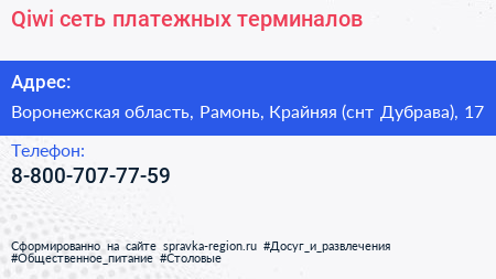 Qiwi, сеть платежных терминалов по адресу Воронежская область, Рамонь, Крайняя (снт Дубрава), 17 в дальнейшем Организация, размещена в следующих категориях: