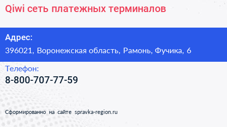 Qiwi, сеть платежных терминалов по адресу 396021, Воронежская область, Рамонь, Фучика, 6 в дальнейшем Организация, размещена в следующих категориях: