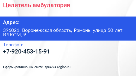Целитель, амбулатория по адресу 396021, Воронежская область, Рамонь, улица 50 лет ВЛКСМ, 9 в дальнейшем Организация, размещена в следующих категориях: