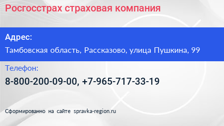Росгосстрах, страховая компания по адресу Тамбовская область, Рассказово, улица Пушкина, 99 в дальнейшем Организация, размещена в следующих категориях: