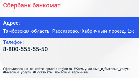 Сбербанк, банкомат по адресу Тамбовская область, Рассказово, Фабричный проезд, 1ж в дальнейшем Организация, размещена в следующих категориях:
