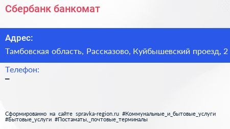 Сбербанк, банкомат по адресу Тамбовская область, Рассказово, Куйбышевский проезд, 2 в дальнейшем Организация, размещена в следующих категориях: