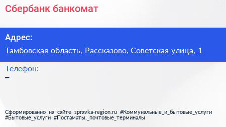Сбербанк, банкомат по адресу Тамбовская область, Рассказово, Советская улица, 1 в дальнейшем Организация, размещена в следующих категориях:
