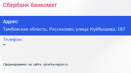 Сбербанк, банкомат по адресу Тамбовская область, Рассказово, улица Куйбышева, 187 в дальнейшем Организация, размещена в следующих категориях: