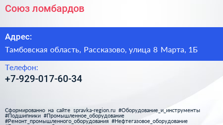 Союз ломбардов по адресу Тамбовская область, Рассказово, улица 8 Марта, 1Б в дальнейшем Организация, размещена в следующих категориях: