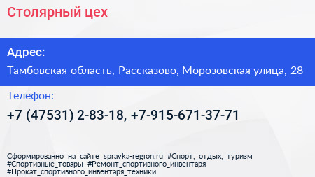 Столярный цех по адресу Тамбовская область, Рассказово, Морозовская улица, 28 в дальнейшем Организация, размещена в следующих категориях: