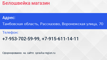 Белошвейка, магазин по адресу Тамбовская область, Рассказово, Воронежская улица, 70 в дальнейшем Организация, размещена в следующих категориях: