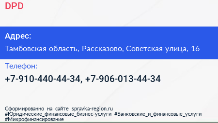 DPD по адресу Тамбовская область, Рассказово, Советская улица, 16 в дальнейшем Организация, размещена в следующих категориях: