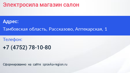 Электросила, магазин-салон по адресу Тамбовская область, Рассказово, Аптекарская, 1 в дальнейшем Организация, размещена в следующих категориях: