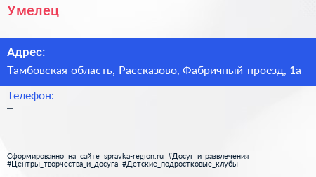 Умелец по адресу Тамбовская область, Рассказово, Фабричный проезд, 1а в дальнейшем Организация, размещена в следующих категориях: