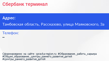 Сбербанк, терминал по адресу Тамбовская область, Рассказово, улица Маяковского, 3а в дальнейшем Организация, размещена в следующих категориях: