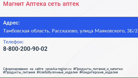 Магнит Аптека, сеть аптек по адресу Тамбовская область, Рассказово, улица Маяковского, 3Б/2 в дальнейшем Организация, размещена в следующих категориях: