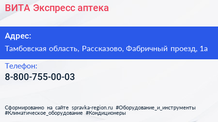 ВИТА Экспресс, аптека по адресу Тамбовская область, Рассказово, Фабричный проезд, 1а в дальнейшем Организация, размещена в следующих категориях: