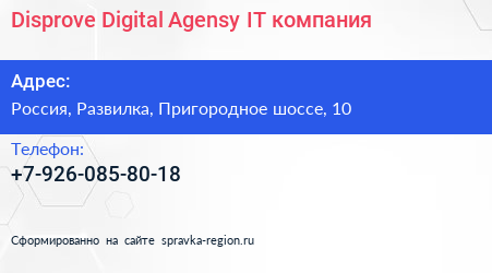 Disprove Digital Agensy, IT-компания по адресу Зоо салон, 10, Пригородное шоссе, микрорайон Пригород Лесное, Мисайлово, Ленинский городской округ, Московская область, Центральный федеральный округ, 142721, Россия в дальнейшем Организация, размещена в следующих категориях: