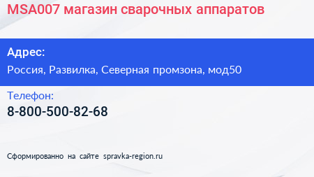 MSA007, магазин сварочных аппаратов по адресу 50, улица Северная промзона, Промзона «Видное-Восточное», Видное, Ленинский городской округ, Московская область, Центральный федеральный округ, 142715, Россия в дальнейшем Организация, размещена в следующих категориях: