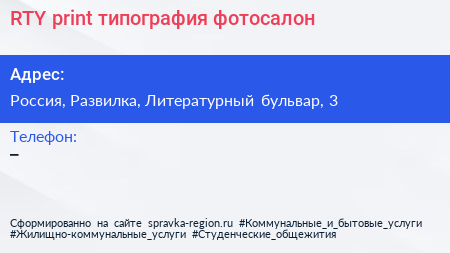 RTY print, типография-фотосалон по адресу 3, Литературный бульвар, микрорайон Пригород Лесное, Мисайлово, Ленинский городской округ, Московская область, Центральный федеральный округ, 142721, Россия в дальнейшем Организация, размещена в следующих категориях: