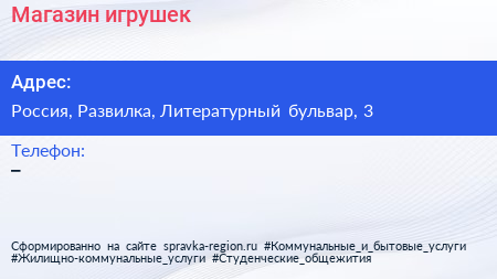 Магазин игрушек по адресу Разливные напитки, 3, Литературный бульвар, микрорайон Пригород Лесное, Мисайлово, Ленинский городской округ, Московская область, Центральный федеральный округ, 142721, Россия в дальнейшем Организация, размещена в следующих категориях: