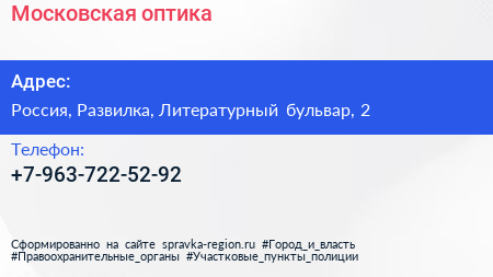 Московская оптика по адресу Ремонт, 2, Литературный бульвар, микрорайон Пригород Лесное, Мисайлово, Ленинский городской округ, Московская область, Центральный федеральный округ, 142721, Россия в дальнейшем Организация, размещена в следующих категориях: