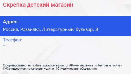 Скрепка, детский магазин по адресу 8, Литературный бульвар, микрорайон Пригород Лесное, Мисайлово, Ленинский городской округ, Московская область, Центральный федеральный округ, 142721, Россия в дальнейшем Организация, размещена в следующих категориях: