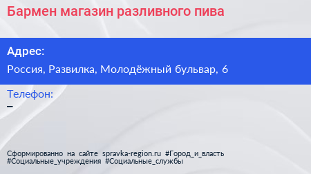 Бармен, магазин разливного пива по адресу Дом быта, 6, Молодёжный бульвар, микрорайон Пригород Лесное, Мисайлово, Ленинский городской округ, Московская область, Центральный федеральный округ, 142721, Россия в дальнейшем Организация, размещена в следующих категориях: