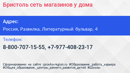 Бристоль, сеть магазинов у дома по адресу Бристоль, 4, Литературный бульвар, микрорайон Пригород Лесное, Мисайлово, Ленинский городской округ, Московская область, Центральный федеральный округ, 142721, Россия в дальнейшем Организация, размещена в следующих категориях: