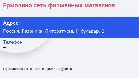 Ермолино, сеть фирменных магазинов по адресу Ozon box, 2, Литературный бульвар, микрорайон Пригород Лесное, Мисайлово, Ленинский городской округ, Московская область, Центральный федеральный округ, 142721, Россия в дальнейшем Организация, размещена в следующих категориях: