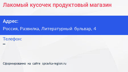 Лакомый кусочек, продуктовый магазин по адресу Лакомый Кусочек, 4, Литературный бульвар, микрорайон Пригород Лесное, Мисайлово, Ленинский городской округ, Московская область, Центральный федеральный округ, 142721, Россия в дальнейшем Организация, размещена в следующих категориях: