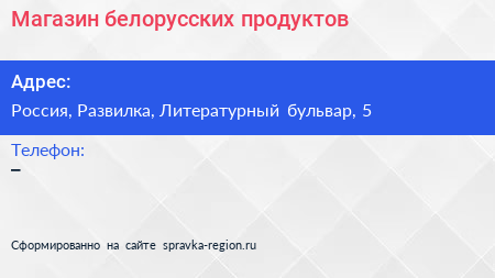 Магазин белорусских продуктов по адресу Белорусские продукты, 5, Литературный бульвар, микрорайон Пригород Лесное, Мисайлово, Ленинский городской округ, Московская область, Центральный федеральный округ, 142721, Россия в дальнейшем Организация, размещена в следующих категориях: