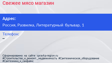 Свежее мясо, магазин по адресу Свежее мясо, 1, Литературный бульвар, микрорайон Пригород Лесное, Мисайлово, Ленинский городской округ, Московская область, Центральный федеральный округ, 142721, Россия в дальнейшем Организация, размещена в следующих категориях: