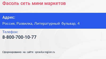 Фасоль, сеть мини-маркетов по адресу 4, Литературный бульвар, микрорайон Пригород Лесное, Мисайлово, Ленинский городской округ, Московская область, Центральный федеральный округ, 142721, Россия в дальнейшем Организация, размещена в следующих категориях: