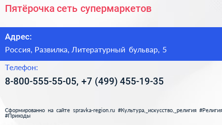Пятёрочка, сеть супермаркетов по адресу Пятёрочка, 5, Литературный бульвар, микрорайон Пригород Лесное, Мисайлово, Ленинский городской округ, Московская область, Центральный федеральный округ, 142721, Россия в дальнейшем Организация, размещена в следующих категориях:
