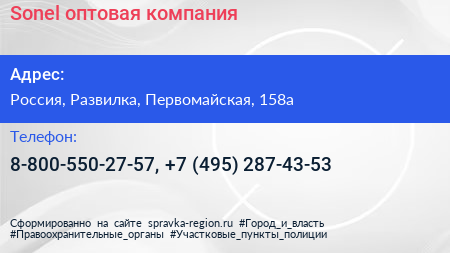 Sonel, оптовая компания по адресу 158А, Первомайская улица, Коттеджный посёлок «Мисайлово», Мисайлово, Ленинский городской округ, Московская область, Центральный федеральный округ, 142714, Россия в дальнейшем Организация, размещена в следующих категориях: