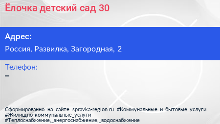 Ёлочка, детский сад №30 по адресу Детский сад №30 «Ёлочка», Литературный бульвар, микрорайон Пригород Лесное, Мисайлово, Ленинский городской округ, Московская область, Центральный федеральный округ, 142721, Россия в дальнейшем Организация, размещена в следующих категориях:
