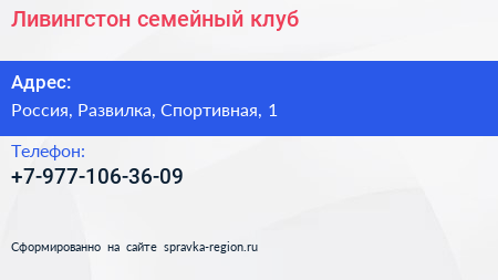 Ливингстон, семейный клуб по адресу КиндерVиль, 1, Спортивная улица, микрорайон Пригород Лесное, Мисайлово, Ленинский городской округ, Московская область, Центральный федеральный округ, 142721, Россия в дальнейшем Организация, размещена в следующих категориях: