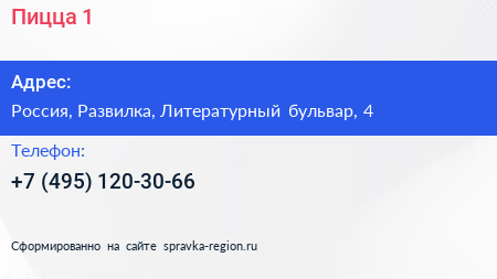 Пицца №1 по адресу 4, Литературный бульвар, микрорайон Пригород Лесное, Мисайлово, Ленинский городской округ, Московская область, Центральный федеральный округ, 142721, Россия в дальнейшем Организация, размещена в следующих категориях: