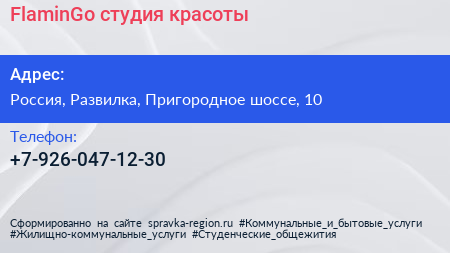 FlaminGo, студия красоты по адресу ВитаМед №1, 10, Пригородное шоссе, микрорайон Пригород Лесное, Мисайлово, Ленинский городской округ, Московская область, Центральный федеральный округ, 142721, Россия в дальнейшем Организация, размещена в следующих категориях: