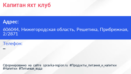 Капитан, яхт-клуб по адресу 606044, Нижегородская область, Решетиха, Прибрежная, 2/2871 в дальнейшем Организация, размещена в следующих категориях: