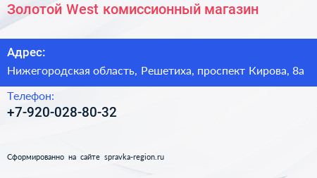 Золотой West, комиссионный магазин по адресу Нижегородская область, Решетиха, проспект Кирова, 8а в дальнейшем Организация, размещена в следующих категориях: