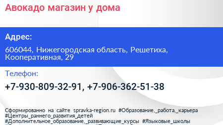 Авокадо, магазин у дома по адресу 606044, Нижегородская область, Решетиха, Кооперативная, 29 в дальнейшем Организация, размещена в следующих категориях:
