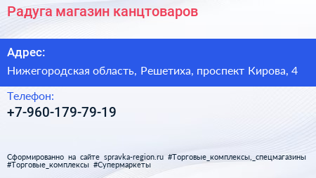 Радуга, магазин канцтоваров по адресу Нижегородская область, Решетиха, проспект Кирова, 4 в дальнейшем Организация, размещена в следующих категориях: