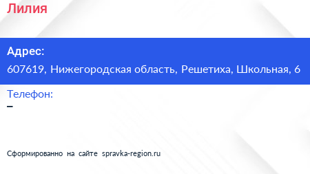 Лилия по адресу 607619, Нижегородская область, Решетиха, Школьная, 6 в дальнейшем Организация, размещена в следующих категориях: