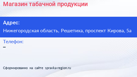 Магазин табачной продукции по адресу Нижегородская область, Решетиха, проспект Кирова, 5а в дальнейшем Организация, размещена в следующих категориях: